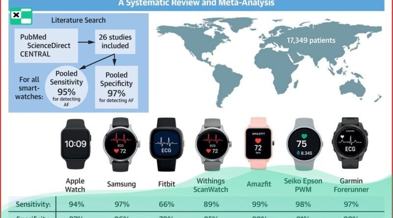 Najnowsza meta-analiza Barrera i współpracowników (2025) zebrała dostępne badania oceniające dokładność urządzeń noszonych w wykrywaniu AFib. Kluczowy wniosek: nie wszystkie PPG są sobie równe — niektóre systemy (na przykład Amazfit w wybranych badaniach) osiągnęły bardzo wysokie wskaźniki diagnostyczne.