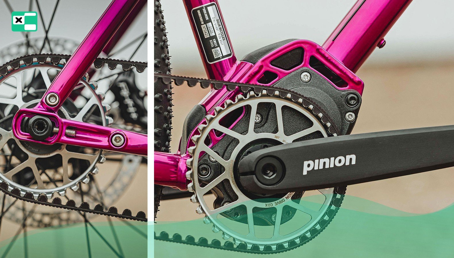 – System napędu: Pinion + Gates CDX (sprocket + pasek) — pasek mniej podatny na zużycie w błocie